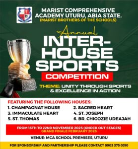 Marist Comprehensive Academy (MCA), Uturu, proudly announces the commencement of its Annual Inter-House Sports Competition, scheduled from 16th to 22nd November 2025 for the knockout stages, with the Grand Finale set for February 2026.